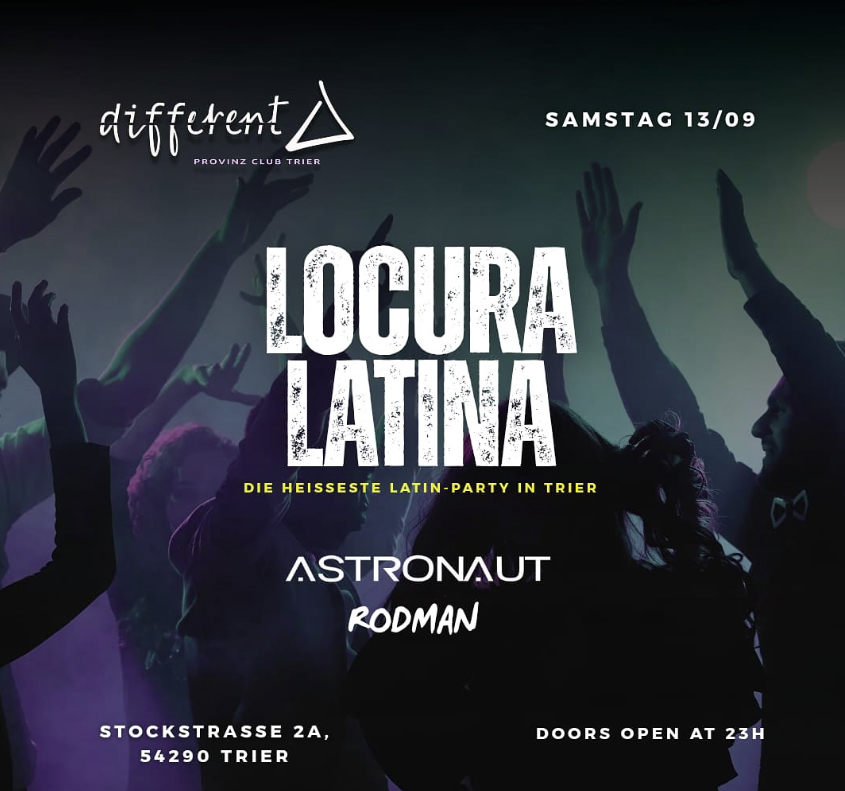 #LocuraLatina #LatinParty #TrierNights #AstronautARG #RodmanBO #LatinVibesGermany #ReggaetonParty #SalsaNight #BachataLovers #DembowFiesta #TrierEvents