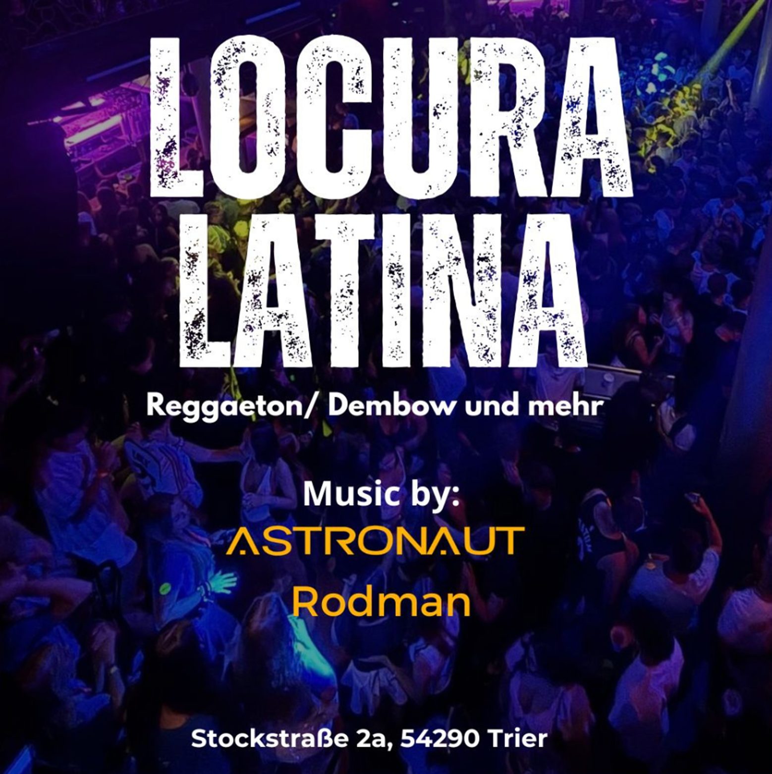 #LocuraLatina #LatinParty #TrierNights #AstronautARG #RodmanBO #LatinVibesGermany #ReggaetonParty #SalsaNight #BachataLovers #DembowFiesta #TrierEvents